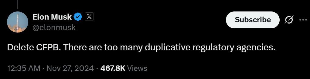 | PayPal | CFPB | Investigation and error-resolution obligations under the Electronic Fund Transfer Act (Regulation E), the presentment of transactions to linked bank accounts, and related matters | The Trump administration ordered a freeze on CFPB investigations and cases | PayPal donated $250,000 to Trump's inaugural fund. Several former PayPal executives and investors who constitute the "PayPal Mafia" are particularly influential in the Trump administration, including Elon Musk, Trump's AI & Crypto Czar David Sacks, and billionaire megadonor Peter Thiel. |