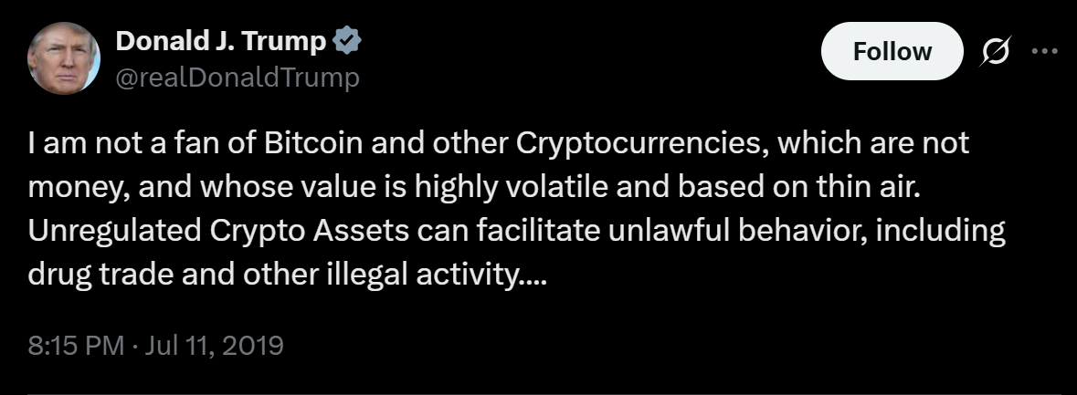 - Trump himself told crypto enthusiasts on the campaign trail, “Sadly, we see the attacks on crypto. It’s a part of a much larger pattern that’s being carried out by the same left-wing fascists to weaponize government against any threat to their power. They’ve done it to me.”