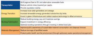 The Climate Action Plan focuses on four key areas: transportation, energy transition, building optimization, and materials management, with three topline goals for each category.