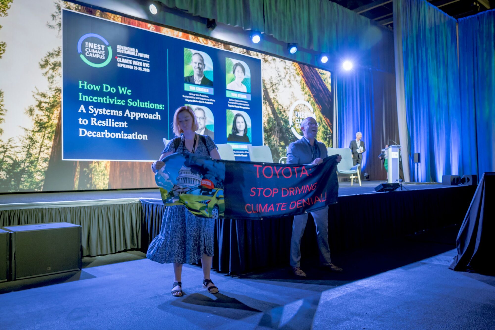 During the event, the activists unfurled a banner reading “Toyota: stop driving climate denial!” and chanted “Hey Toyota, stop toying with the climate!”
