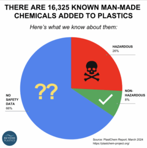 - More than 16,000 chemicals are used to make plastic, including at least 4,200 that scientists classify as chemicals of concern and nearly 9,800 that haven’t been tested for safety (Beyond Plastics)